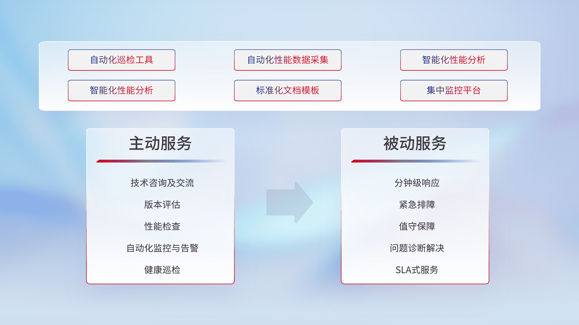 智能化工具和标准化文档,,,保障服务质量,,,提供主动服务(包含技术咨询、、版本评估、、、性能检查、、、自动化监控与告警、、、健康巡检)和被动服务包含(分钟级响应、、紧急排障、、、值守保障、、、问题诊断解决、、SLA服务)。。。。