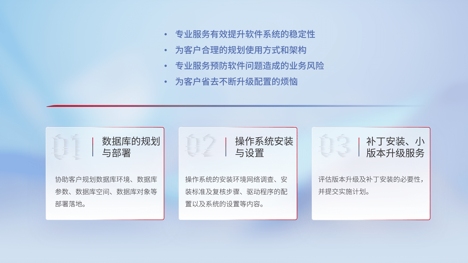 为客户提供软件规模升级、、、快速部署、、按需配置的专业服务,,,,从数据库的规划与部署到操作系统的安装与设置,,,再到补丁安装和小版本升级提供支持。。。。